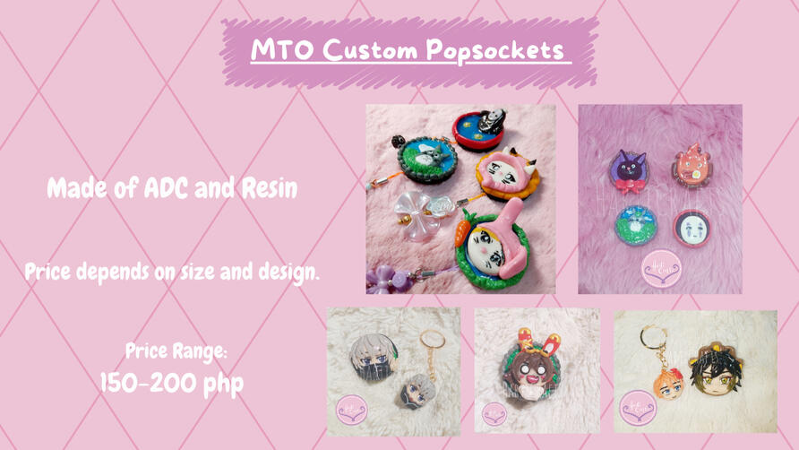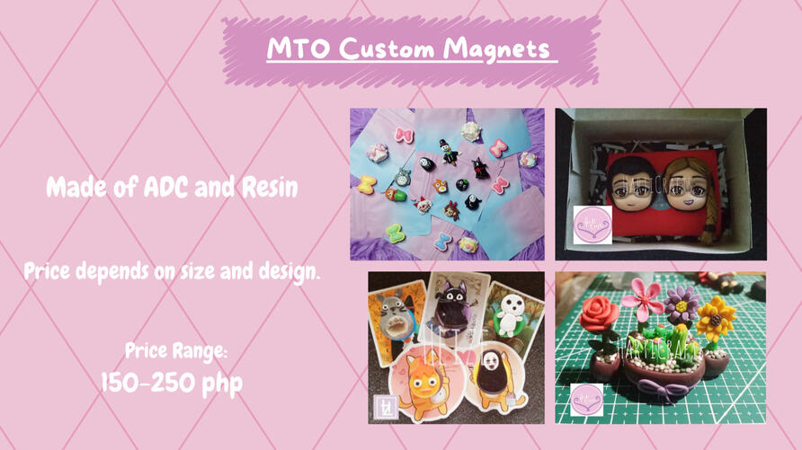 Hi! Im Heize/Heizheru, owner of Harticrafts! We make clay crafts such as Phone Hippers, Magnets, Keycaps, Popsockets, Keychains and Figures. We also accept commission/made to order clay crafts! We also sell Stickers -- Original Art or Fanart.